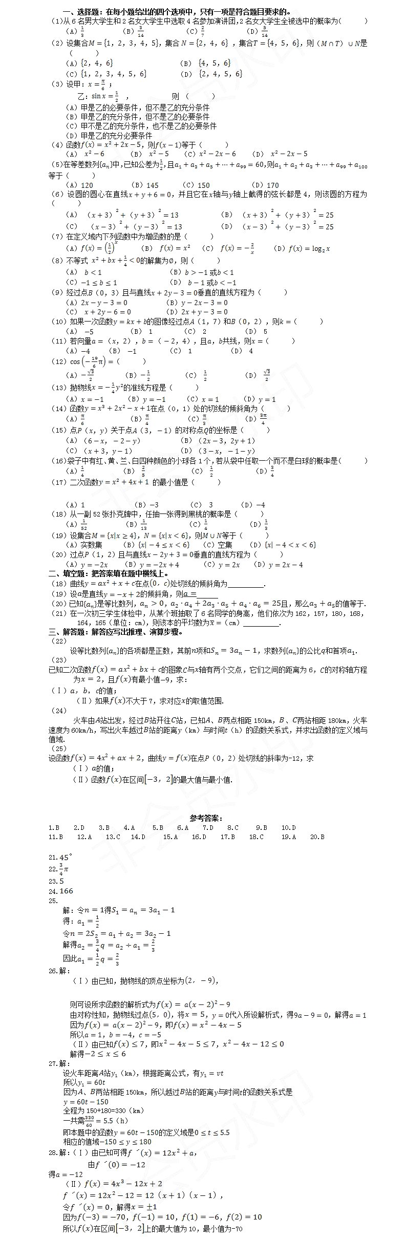 - 2009年湖北成人高考高起點(diǎn)數(shù)學(xué)(文)真題及答案
