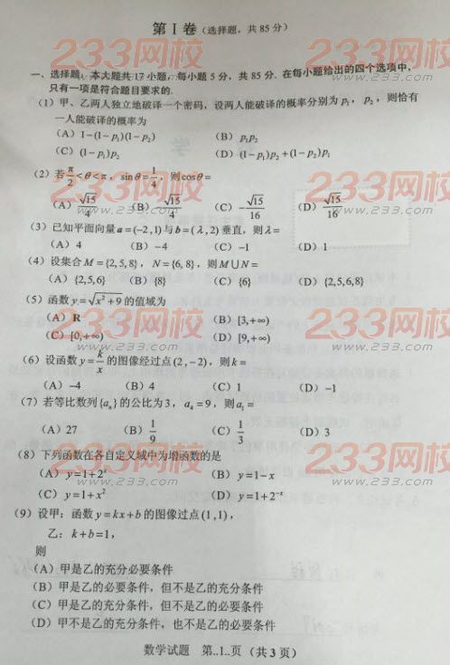 2015年湖北成人高考高起點(diǎn)理工類數(shù)學(xué)考試試題
