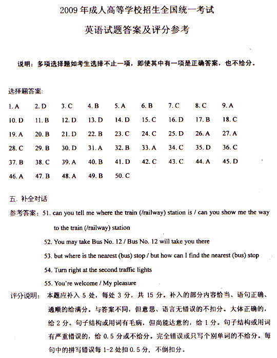 2009年湖北成考高起點(diǎn)英語真題及參考答案