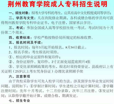 湖北成人高考網(wǎng)獲悉,2015年荊州教育學(xué)院成教招生簡章已公布,詳情如下: