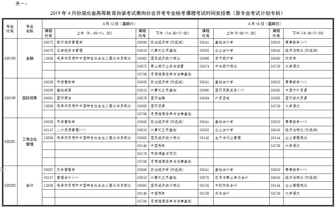 2019年4月湖北自考面向社會開考專業(yè)統(tǒng)考課程考試時間安排表(原專業(yè)考試計劃專科)