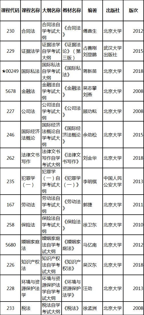 湖北自考專升本法學(xué)專業(yè)2019年4月考試科目及教材(新課改)