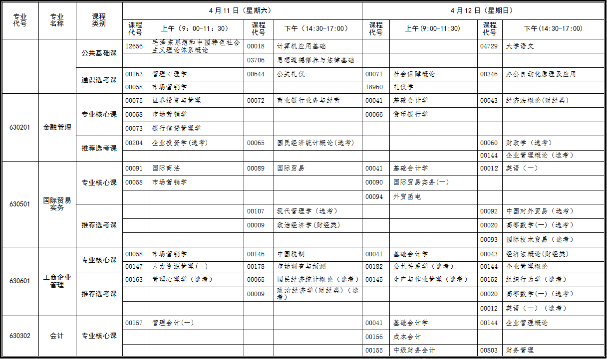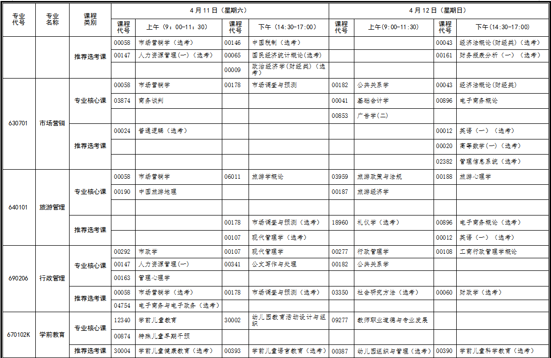 2020年4月湖北自考網(wǎng)上報(bào)考截止時(shí)間:2020年3月4日17時(shí),自2020年起,湖北省原專業(yè)計(jì)劃不再安排課程考試。自2021年起,不再辦理原專業(yè)畢業(yè)證書。原專業(yè)在籍考生在過渡期間不能完成原計(jì)劃課程考試的,可依據(jù)《關(guān)于做好湖北省自學(xué)考試新舊專業(yè)轉(zhuǎn)接的通知》(鄂自考[2019]11號)文件精神轉(zhuǎn)接到新專業(yè)繼續(xù)報(bào)考。2020年4月份考試時(shí)間為4月10-12日,2020年4月湖北自考專科面向社會開考專業(yè)統(tǒng)考課程考試時(shí)間安排表如下: