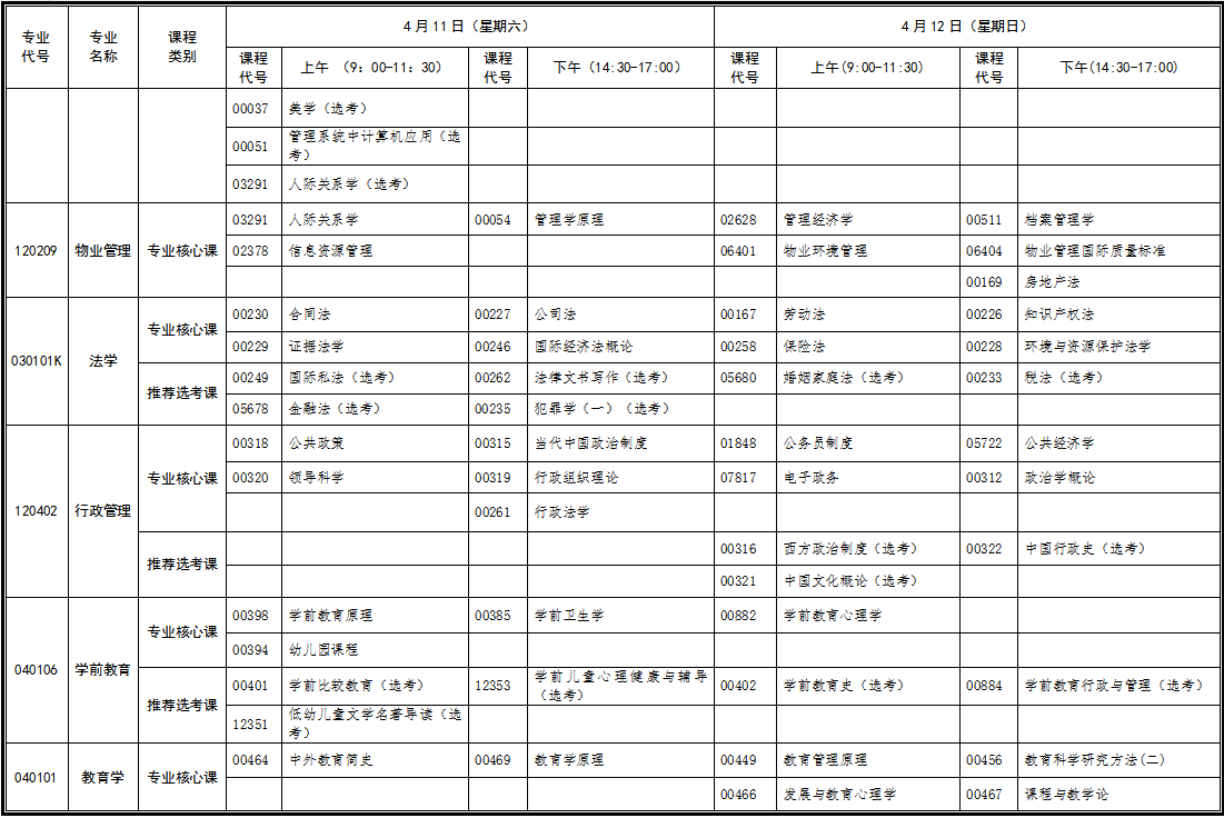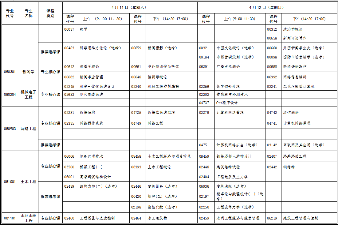 2020年4月份湖北自考考試時(shí)間為4月10-12日,自2020年起,湖北省原專業(yè)計(jì)劃不再安排課程考試。自2021年起,不再辦理原專業(yè)畢業(yè)證書。原專業(yè)在籍考生在過渡期間不能完成原計(jì)劃課程考試的,可依據(jù)《關(guān)于做好湖北省自學(xué)考試新舊專業(yè)轉(zhuǎn)接的通知》(鄂自考[2019]11號(hào))文件精神轉(zhuǎn)接到新專業(yè)繼續(xù)報(bào)考。2020年4月湖北自考網(wǎng)上報(bào)考截止時(shí)間:2020年3月4日17時(shí),2020年4月湖北自考專升本面向社會(huì)開考專業(yè)統(tǒng)考課程考試時(shí)間安排表如下: