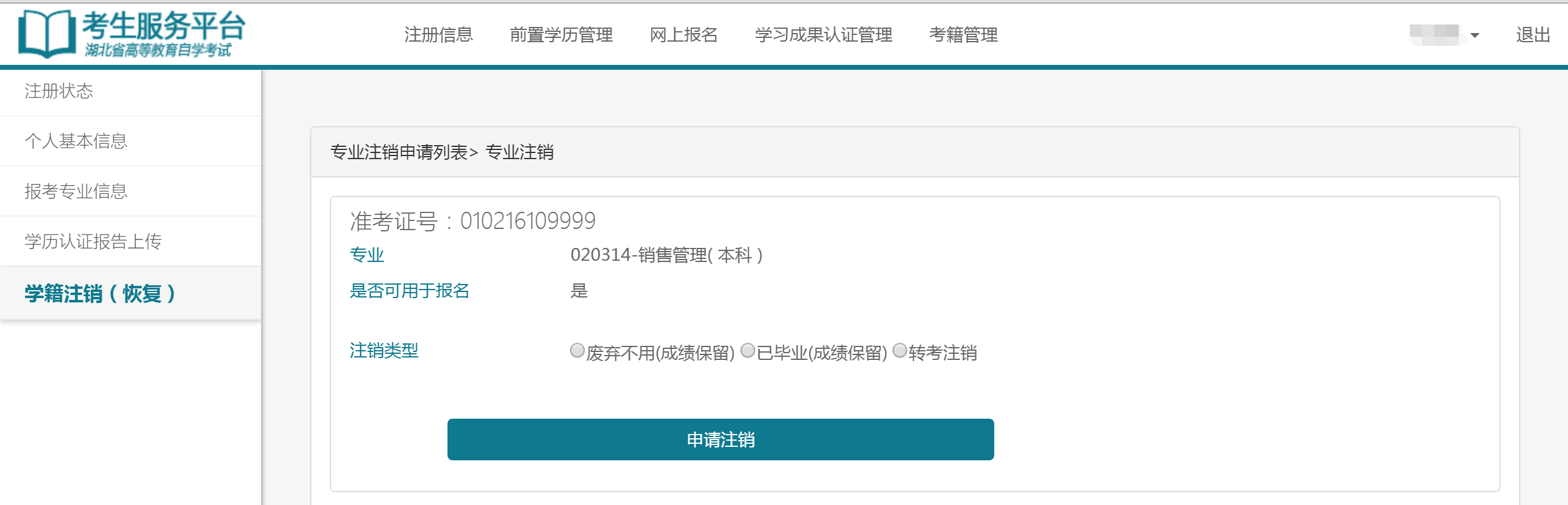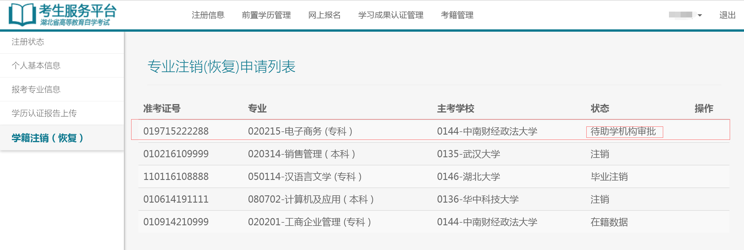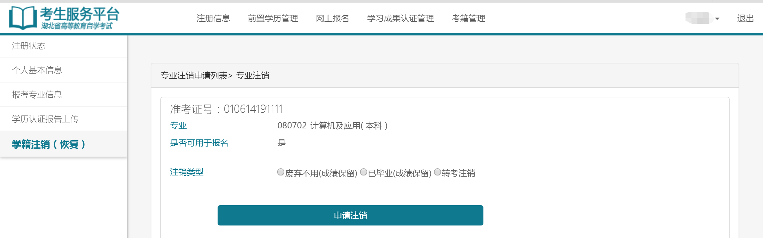 1)注冊完成后,進入注冊信息---學籍注銷(恢復)頁面: