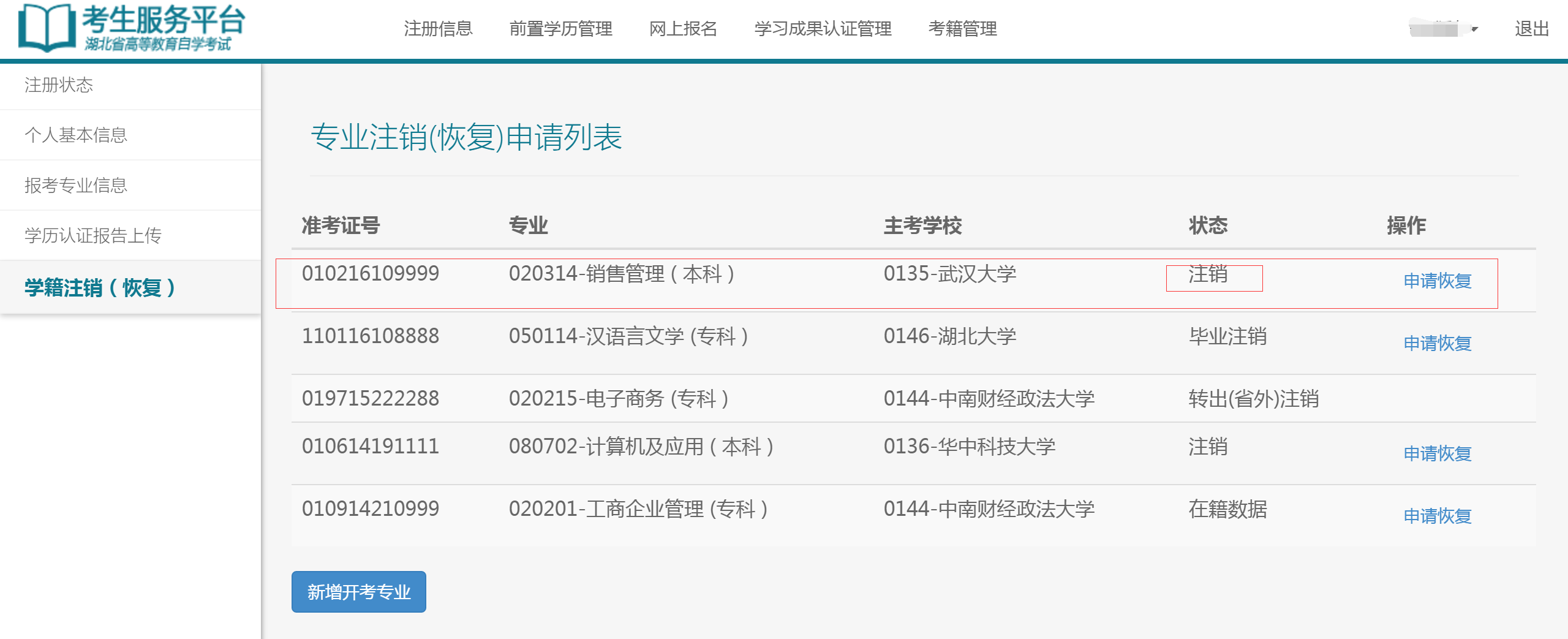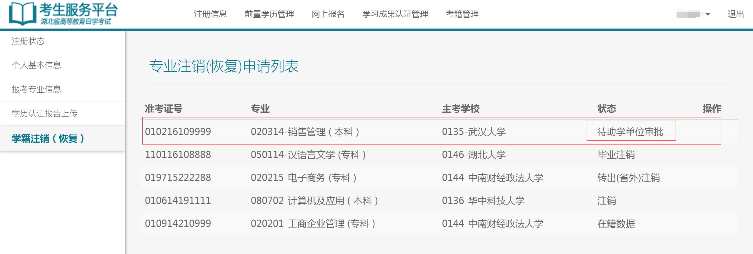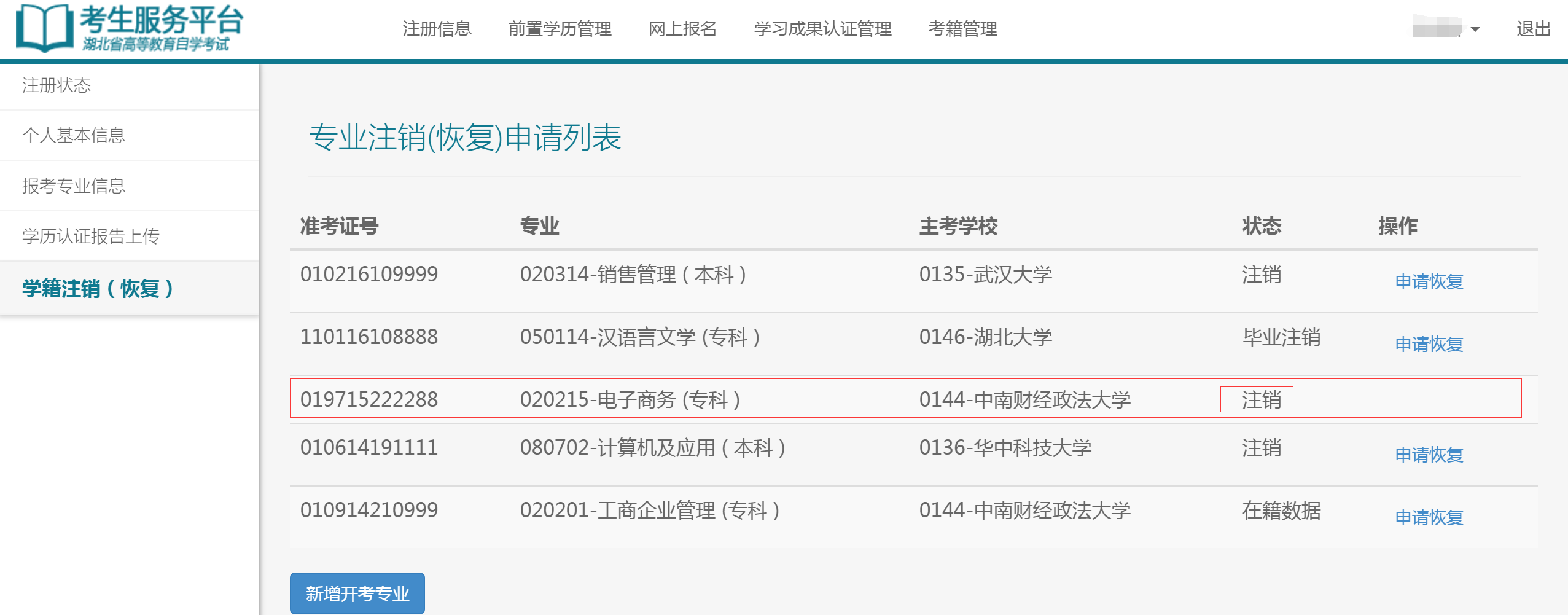 1)注冊完成后,進入注冊信息---學籍注銷(恢復)頁面: