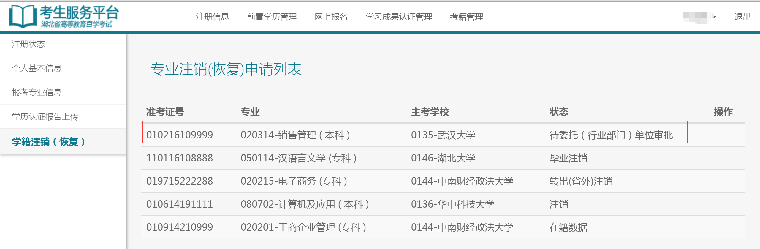 ? 注銷類型分為:廢棄不用(成績保留)、已畢業(yè)(成績保留)和轉考注銷,考生根據實際情況選擇注銷類型。 ? 系統(tǒng)考生申請注銷后需要要兩審批,如下圖狀態(tài)變?yōu)榇鷮W單位審批,這時注銷并未生效: