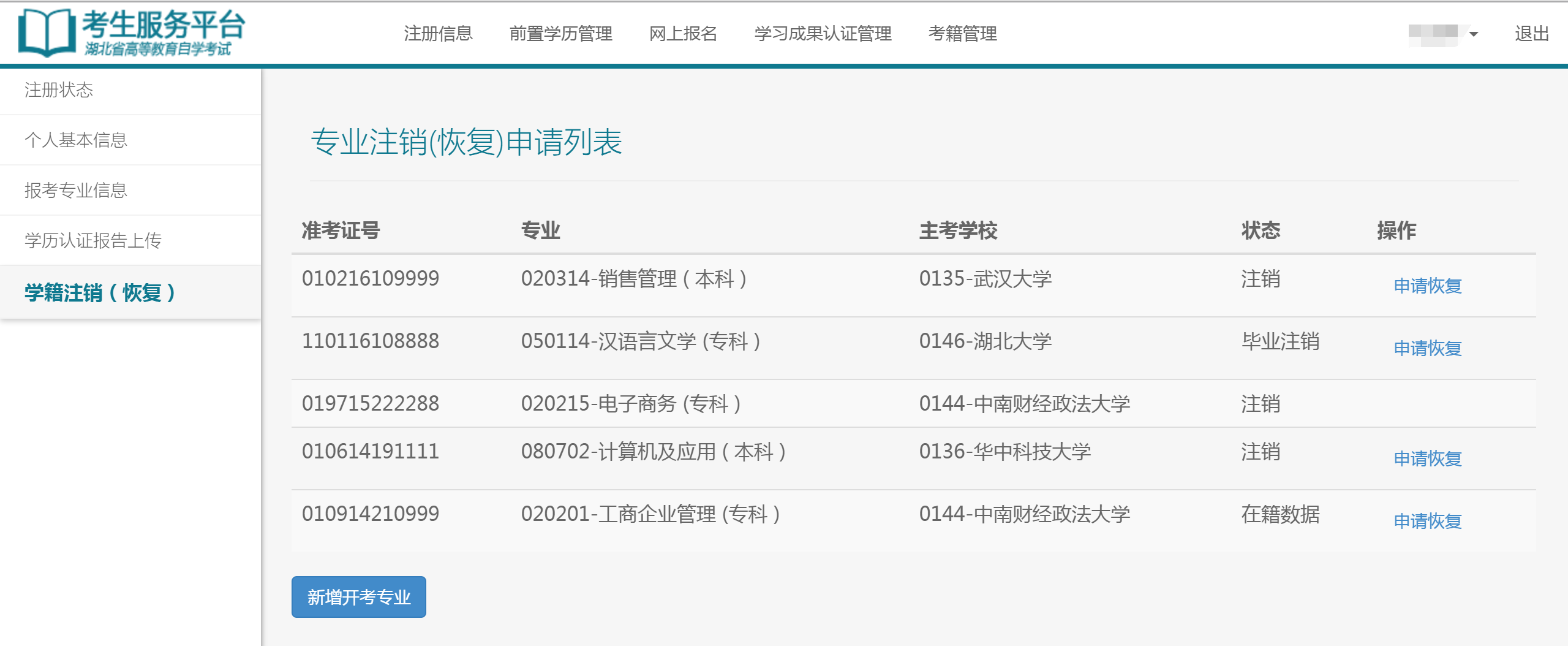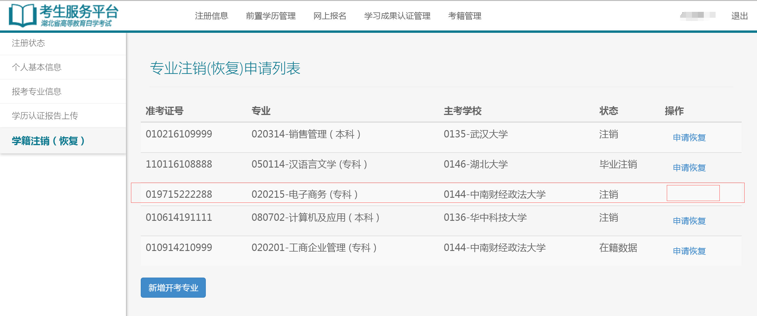 5)點(diǎn)擊新增開考專業(yè),重新注冊(cè)一個(gè)新的學(xué)籍。