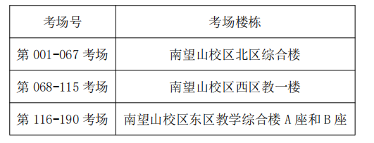 1.考試地點(diǎn)根據(jù)考場(chǎng)號(hào)分別設(shè)在中國(guó)地質(zhì)大學(xué)(武漢)南望山校區(qū)北區(qū)綜合樓、西區(qū)教一樓以及東區(qū)教學(xué)綜合樓A座和B座,為了便于大家查找,請(qǐng)各位考生根據(jù)自己考場(chǎng)號(hào)對(duì)應(yīng)的考場(chǎng)樓棟進(jìn)行導(dǎo)航。