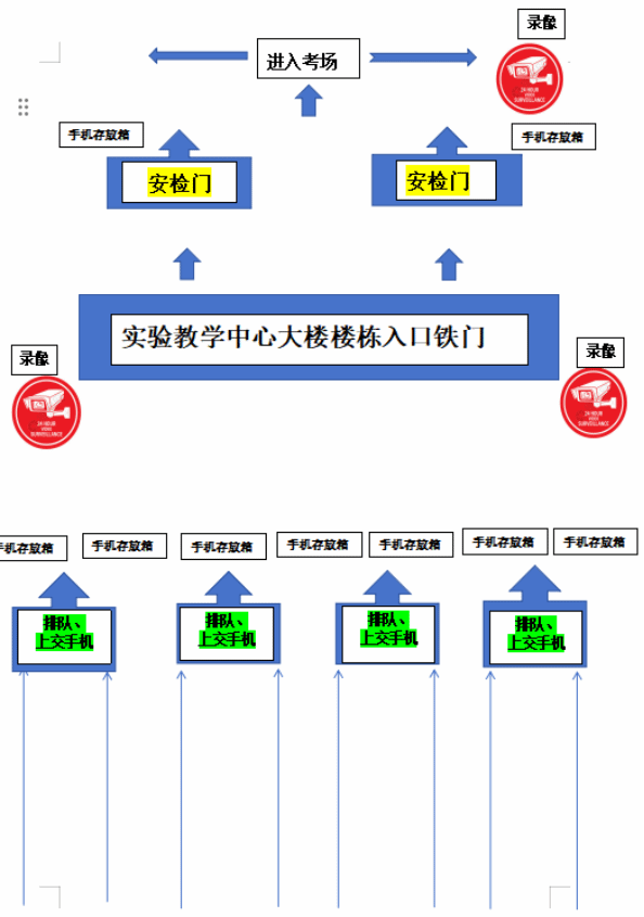 按照文后附件2.的圖示,武昌理工學(xué)院考生進(jìn)入考場大門分三個關(guān)口:排隊關(guān)口、收手機(jī)關(guān)口、安檢門關(guān)口。
