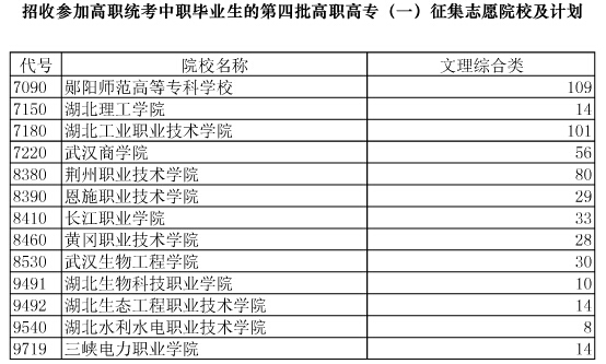 湖北2014年招收參加高職統(tǒng)考中職畢業(yè)生的第四批高職高專(一)征集志愿院校及計(jì)劃