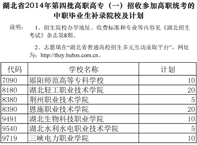 湖北2014年第四批高職高專(一)招收參加高職統(tǒng)考的中職畢業(yè)生補(bǔ)錄院校及計(jì)劃