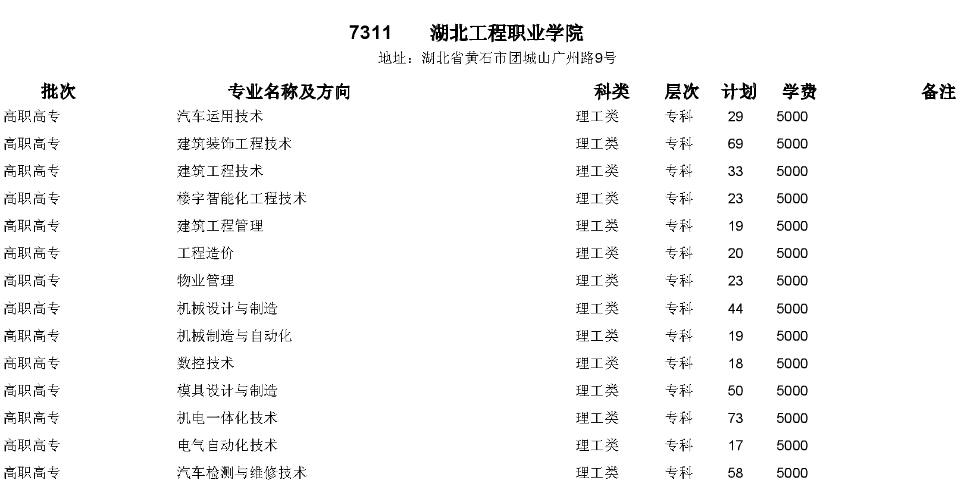 湖北工程職業(yè)學院2015年在湖北省招生計劃