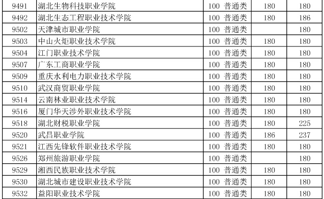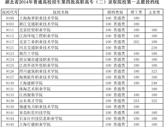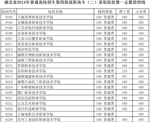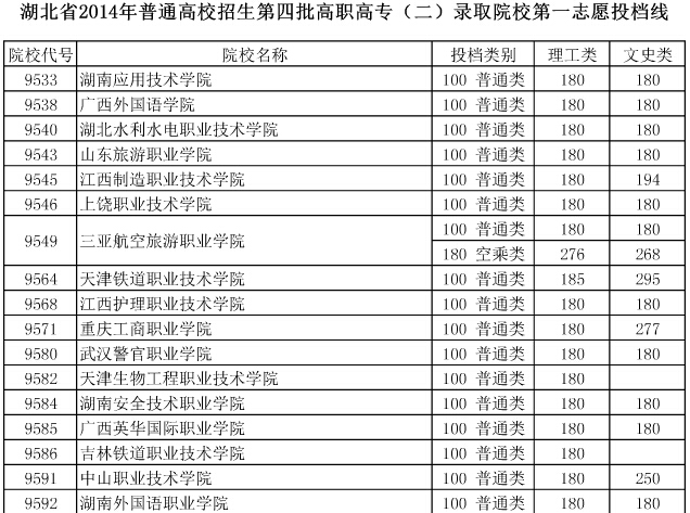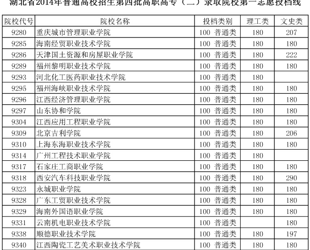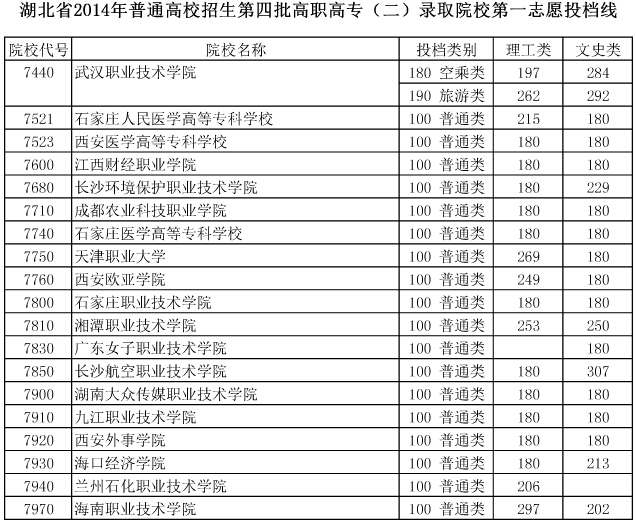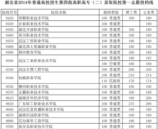湖北2014年高招第四批高職高專(二)錄取院校第一志愿投檔線