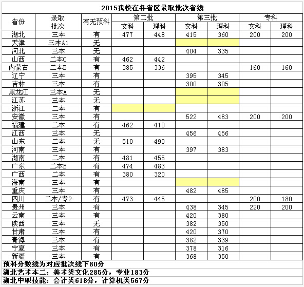 武漢工商學(xué)院2015年各省區(qū)錄取批次分?jǐn)?shù)線