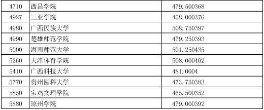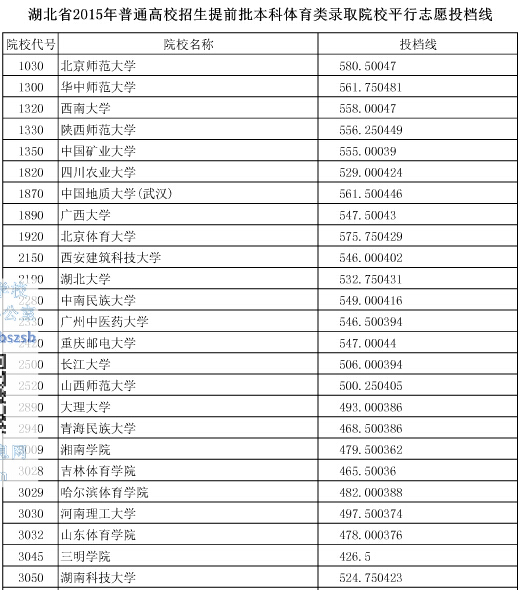 湖北2015年高招提前批本科體育類錄取院校平行志愿投檔線