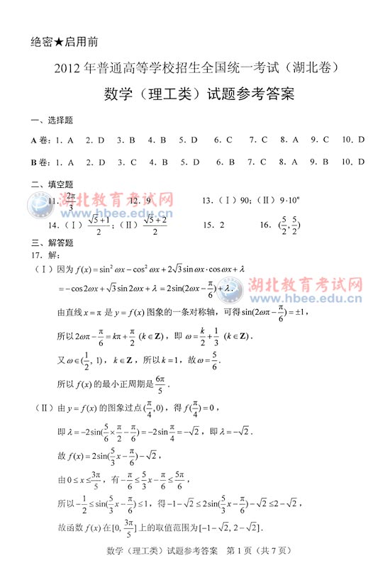 "2012年湖北省高考數(shù)學(xué)理科A卷試題答案" 相關(guān)文章推薦