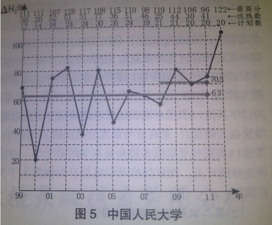 由圖中相應數(shù)據(jù)我們可以非常容易地查出中國人民大學任何年度的錄取情況。如2003年人大的招生計劃、第一志愿達線人數(shù)分別是:24人和31人,而錄取最高分線增量為117分(由此可立即算出錄取最高分的原始分為117+487=604分,其中487分為2003年山西省第一批本科最抵控制線)。