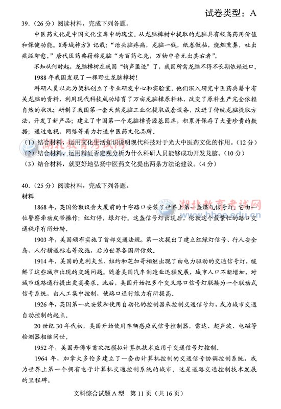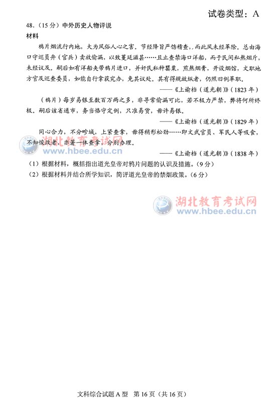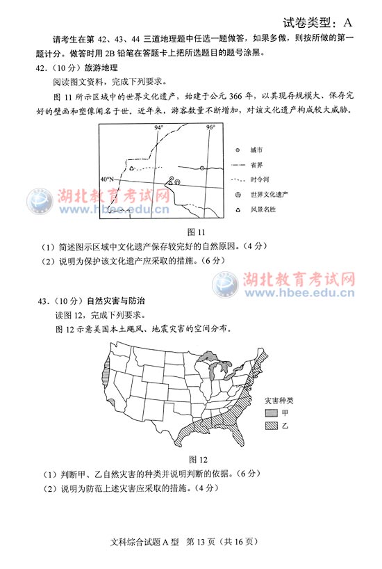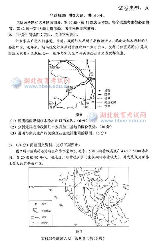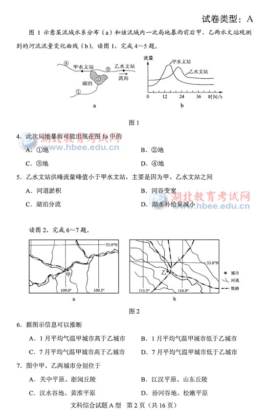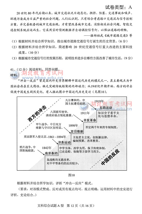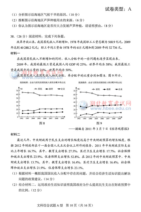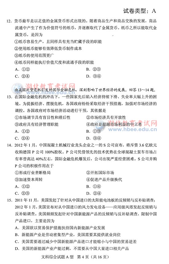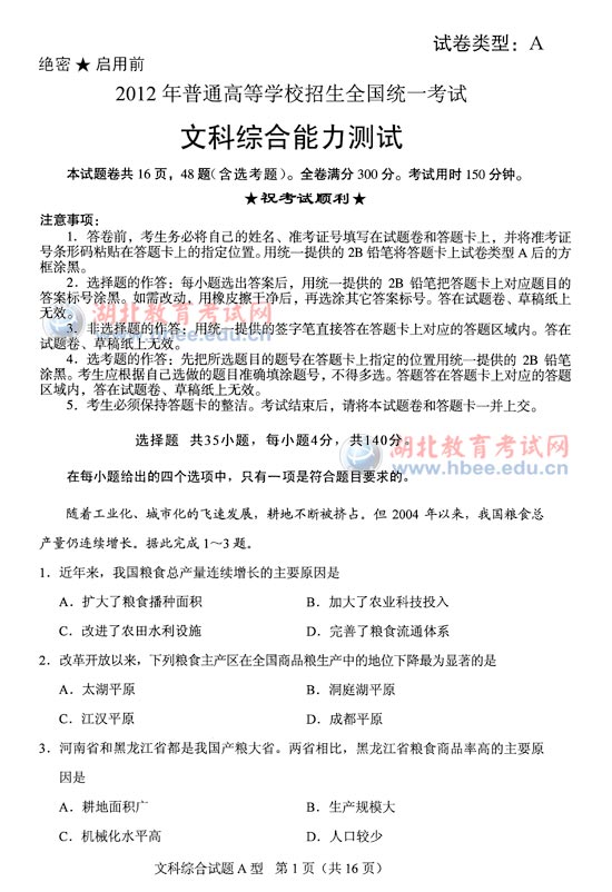 湖北省2012年高考文綜A卷試題