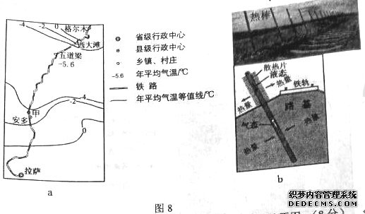 (3)根據(jù)熱棒的工作原理,判斷熱棒散熱的工作季節(jié)(冬季或夏季)簡(jiǎn)述判斷依據(jù),分析熱棒傾斜設(shè)置(圖8b)的原因。(8分)