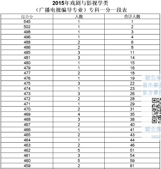 湖北高考網(wǎng)獲悉,2015年湖北高考戲劇與影視學(xué)類(廣播電視編導(dǎo))專科一分一段表如下: