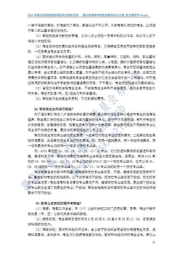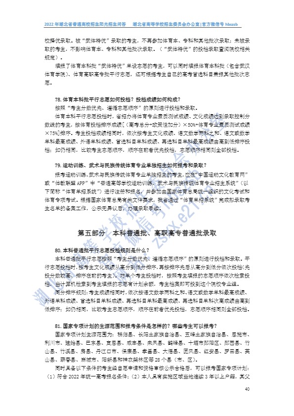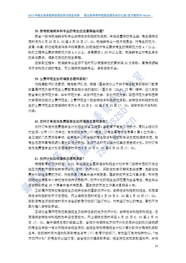 2022年06月15日,湖北省招辦發(fā)布了2022年湖北省普通高校招生陽光招生問答,問答中收錄了高考政策規(guī)定、填報志愿須知、不同類型考生注意事項等考生疑惑比較多的問題和解答,供大家參考。