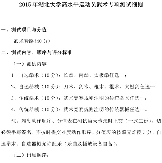 湖北大學(xué)2015年高水平運(yùn)動(dòng)員武術(shù)專項(xiàng)測(cè)試細(xì)則
