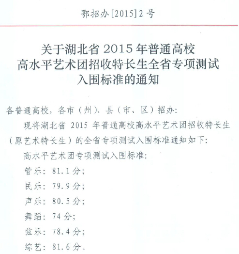 湖北省2015年普通高校高水平藝術(shù)團(tuán)招收特長(zhǎng)生全省專項(xiàng)測(cè)試入圍標(biāo)準(zhǔn)