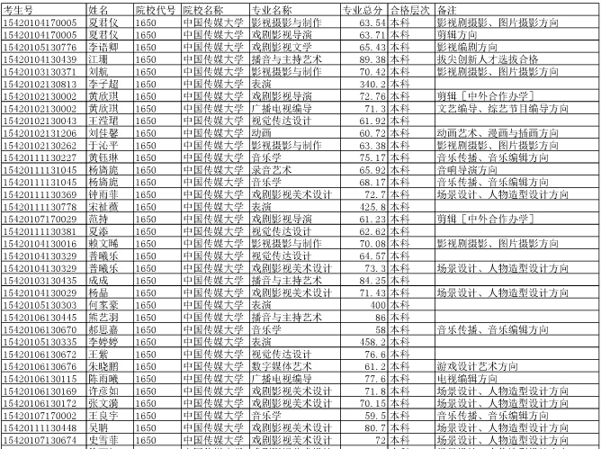 中國傳媒大學2015年在湖北省招生藝術專業(yè)合格考生名單