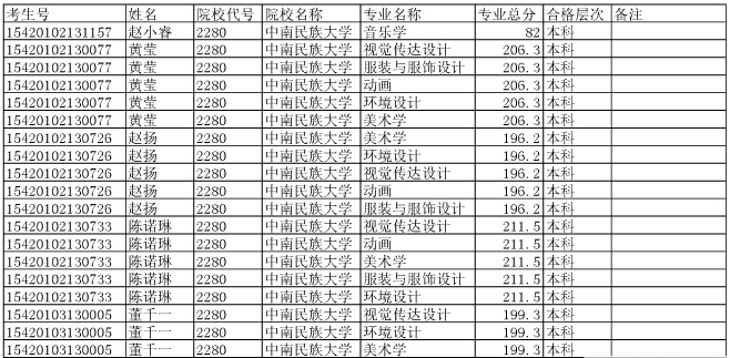 中南民族大學(xué)2015年在湖北省招生藝術(shù)專業(yè)合格考生名單