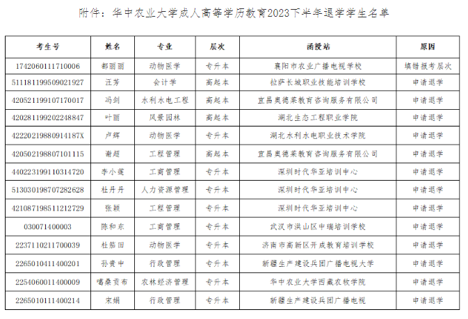 2023年華中農(nóng)業(yè)大學(xué)成教下半年退學(xué)學(xué)生公示已經(jīng)公布了,下面我們就一起來看看都有哪些同學(xué)申請(qǐng)了退學(xué)。