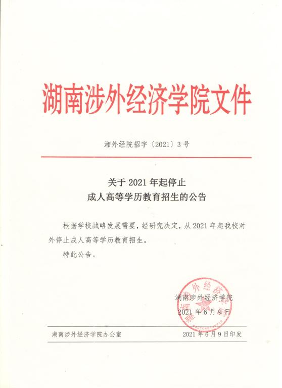 湖南涉外經(jīng)濟學院2021年起停止成人高等教育招生公告