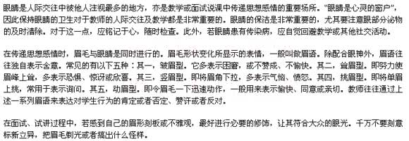 一、教師的面容 儀容,在很大程度上指的就是人的面容。修飾面容,首先要做到清潔,即要勤于洗臉,使之干凈清爽,無(wú)汗?jié)n、無(wú)油污、無(wú)淚痕、無(wú)其他任何不潔之物。修飾面容的要求,具體到各個(gè)不同的部位,還有一些不盡相同之處。 面容,在此指的是人們面部所顯示出的綜合性表情。它既可對(duì)眼神、笑容發(fā)揮輔助作用,也可以自成一體,表現(xiàn)自己的獨(dú)特含義。通過(guò)面容所顯示的表情具有兩重性特征∶其一,變化迅速,很少凝固不變。其二,彼此配合,時(shí)常合作。根據(jù)一般規(guī)律,通過(guò)面容所顯示的表情,既有面部各部分局部顯示的,又有它們彼此合作、綜合顯示的。 對(duì)一般教師的人際交際,面容衛(wèi)生都是不可以缺少的,何況是對(duì)待面試、試講這樣的重要場(chǎng)合。因此,面試人員一定首要從自己的干凈、整潔的面容人手,給評(píng)委和學(xué)生留下良好的第一印象。 (一)眼部