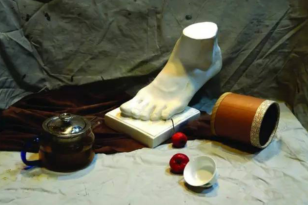 三、模擬寫生內(nèi)容:一個石膏模型,一個玻璃茶壺,一個白瓷茶杯,一個紙筒,兩顆山楂,一塊淺色襯布,一塊灰色襯布,一塊深色襯布。(見圖片小樣)