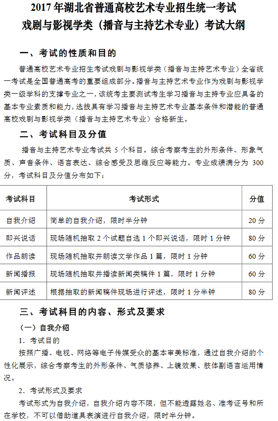 2017年湖北省藝術(shù)統(tǒng)考(播音與主持藝術(shù)專業(yè))考試大綱