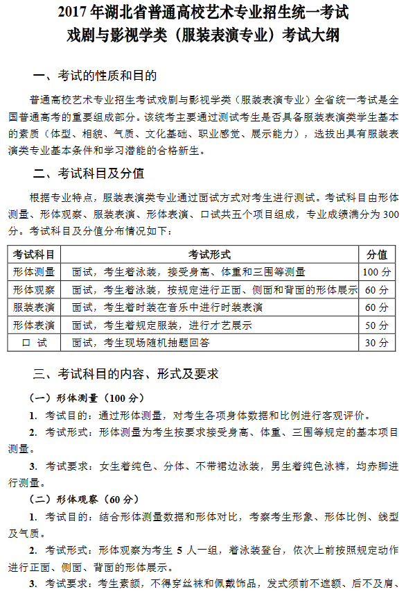 2017年湖北省藝術(shù)統(tǒng)考(服裝表演專業(yè))考試大綱