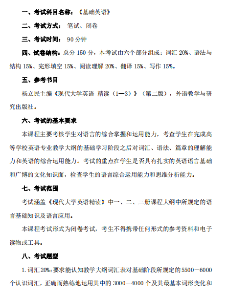 2021年湖北師范大學(xué)文理學(xué)院普通專升本《基礎(chǔ)英語(yǔ)》考試大綱介紹如下,試卷總分150分,考試由六部分組成,分別是詞匯、語(yǔ)法與結(jié)構(gòu)、完形填空、閱讀理解、翻譯和寫(xiě)作等,考試時(shí)長(zhǎng)為90分鐘,考試形式閉卷考試,如果找不到復(fù)習(xí)的方向,其實(shí)大家仔細(xì)看考試大綱就行,會(huì)有詳細(xì)的考試內(nèi)容。