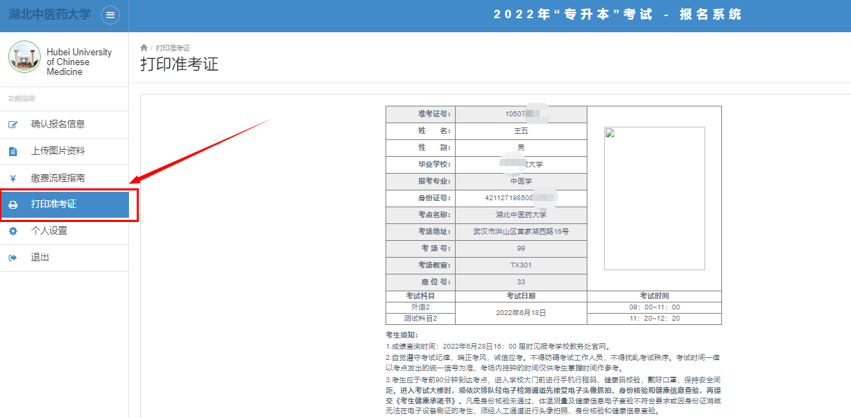 關(guān)于打印2022年湖北中醫(yī)藥大學(xué)專升本考試準(zhǔn)考證的通知