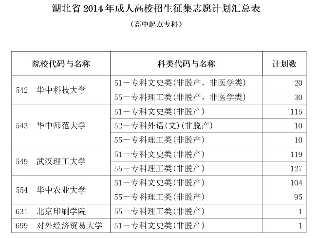湖北2014年成人高考征集志愿計劃匯總表(高中起點專科)