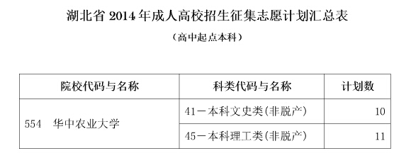 湖北2014年成人高考征集志愿計劃匯總表(高中起點本科)