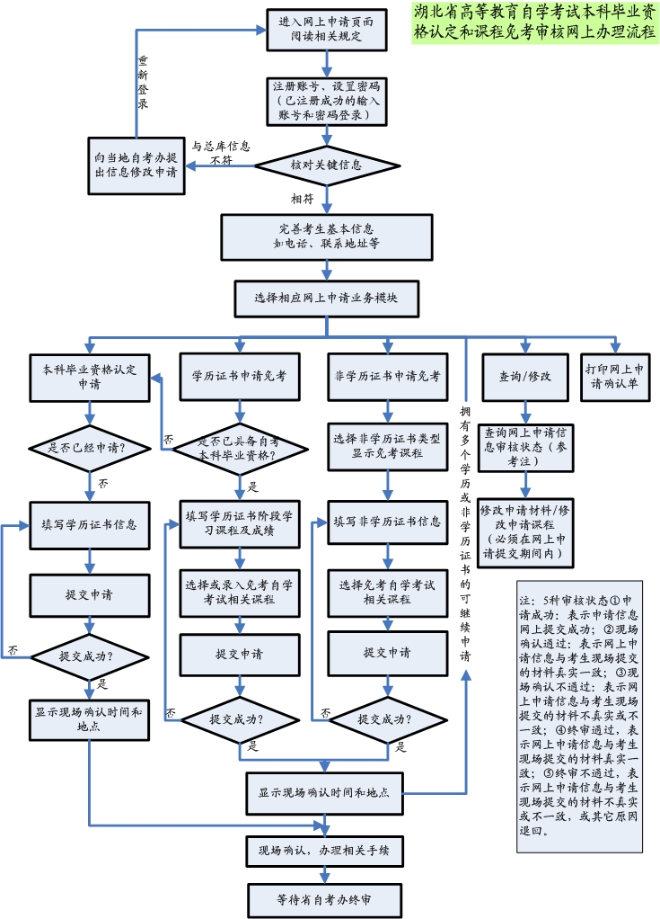2015年湖北自考本科畢業(yè)資格認定和課程免考考生網(wǎng)上申請流程圖如下: