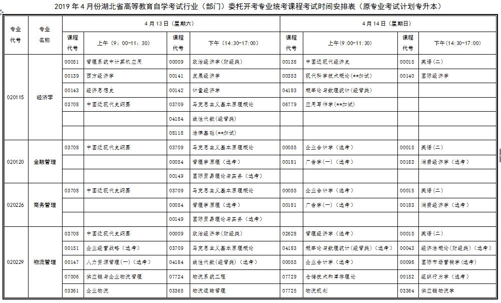 2019年4月份湖北省高等教育自學(xué)考試行業(yè)(部門)委托開考專業(yè)統(tǒng)考課程考試時(shí)間安排表(原專業(yè)考試計(jì)劃專升本)
