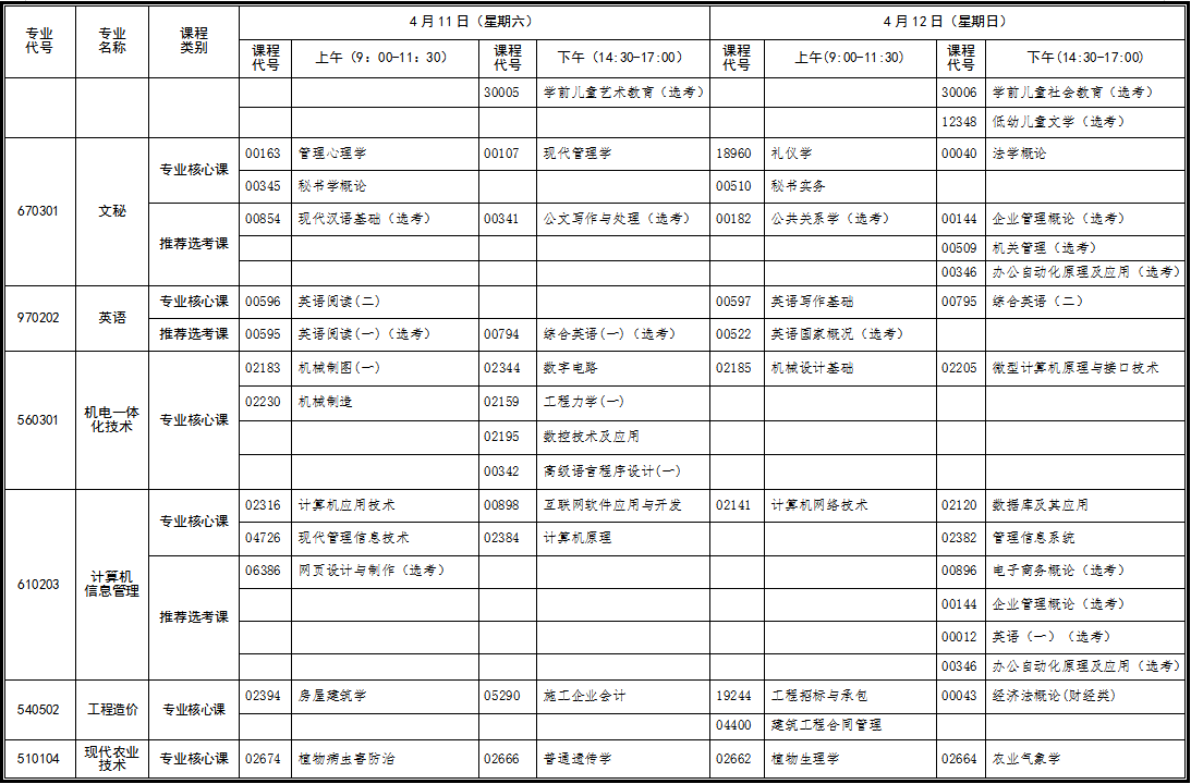 2020年4月湖北自考網(wǎng)上報(bào)考截止時(shí)間:2020年3月4日17時(shí),自2020年起,湖北省原專業(yè)計(jì)劃不再安排課程考試。自2021年起,不再辦理原專業(yè)畢業(yè)證書。原專業(yè)在籍考生在過渡期間不能完成原計(jì)劃課程考試的,可依據(jù)《關(guān)于做好湖北省自學(xué)考試新舊專業(yè)轉(zhuǎn)接的通知》(鄂自考[2019]11號)文件精神轉(zhuǎn)接到新專業(yè)繼續(xù)報(bào)考。2020年4月份考試時(shí)間為4月10-12日,2020年4月湖北自考專科面向社會開考專業(yè)統(tǒng)考課程考試時(shí)間安排表如下: