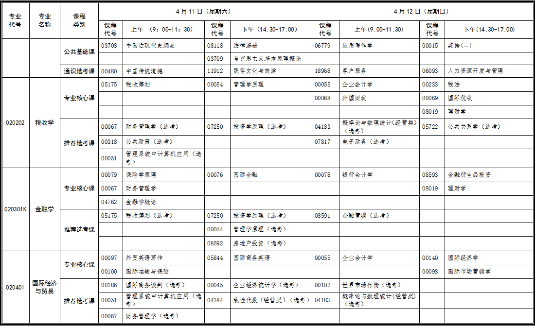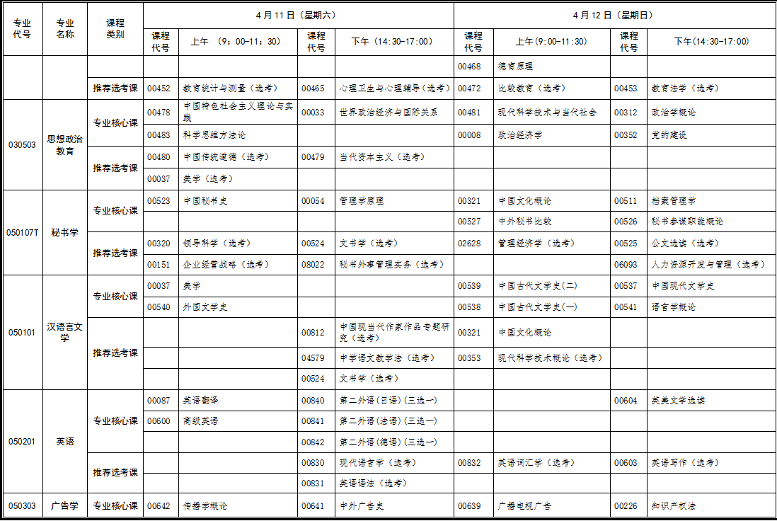 2020年4月份湖北自考考試時(shí)間為4月10-12日,自2020年起,湖北省原專業(yè)計(jì)劃不再安排課程考試。自2021年起,不再辦理原專業(yè)畢業(yè)證書。原專業(yè)在籍考生在過渡期間不能完成原計(jì)劃課程考試的,可依據(jù)《關(guān)于做好湖北省自學(xué)考試新舊專業(yè)轉(zhuǎn)接的通知》(鄂自考[2019]11號(hào))文件精神轉(zhuǎn)接到新專業(yè)繼續(xù)報(bào)考。2020年4月湖北自考網(wǎng)上報(bào)考截止時(shí)間:2020年3月4日17時(shí),2020年4月湖北自考專升本面向社會(huì)開考專業(yè)統(tǒng)考課程考試時(shí)間安排表如下: