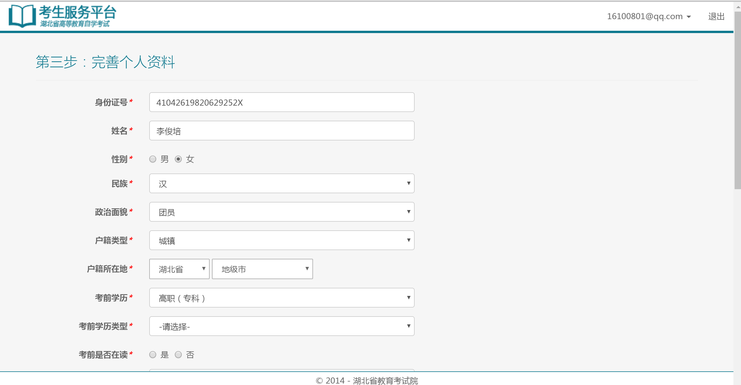 選擇一條在籍信息后,平臺會調(diào)出此條在籍信息的全部信息,考生完善修改信息