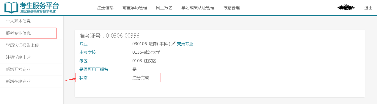 身份驗證成功即注冊完成,考生可在報考專業(yè)信息中查看狀態(tài)已變?yōu)樽酝瓿桑藭r不會再