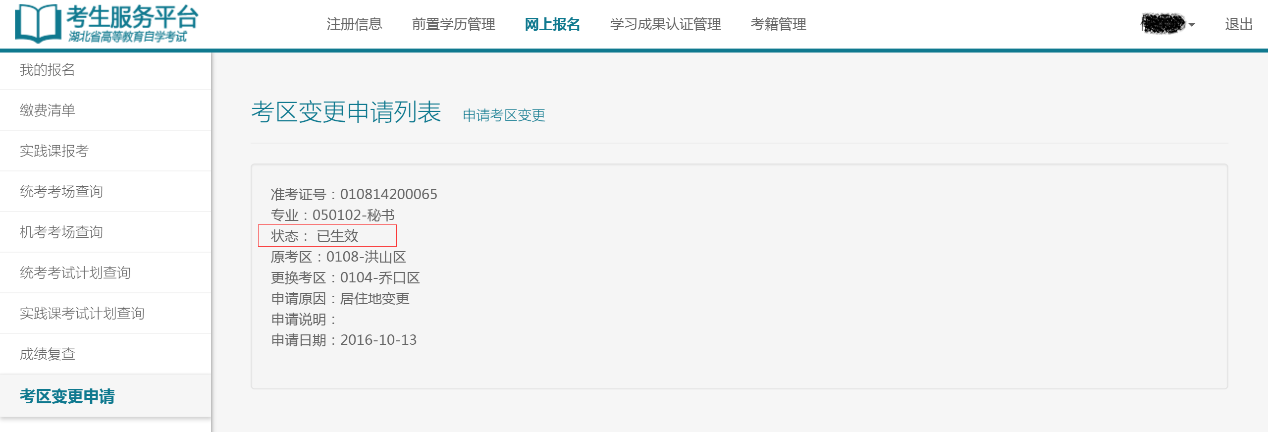 審批通過后狀態(tài)變?yōu)橐焉В蛇M(jìn)入注冊(cè)信息---報(bào)考專業(yè)信息頁(yè)面查看考區(qū)已變?yōu)樾碌目紖^(qū):