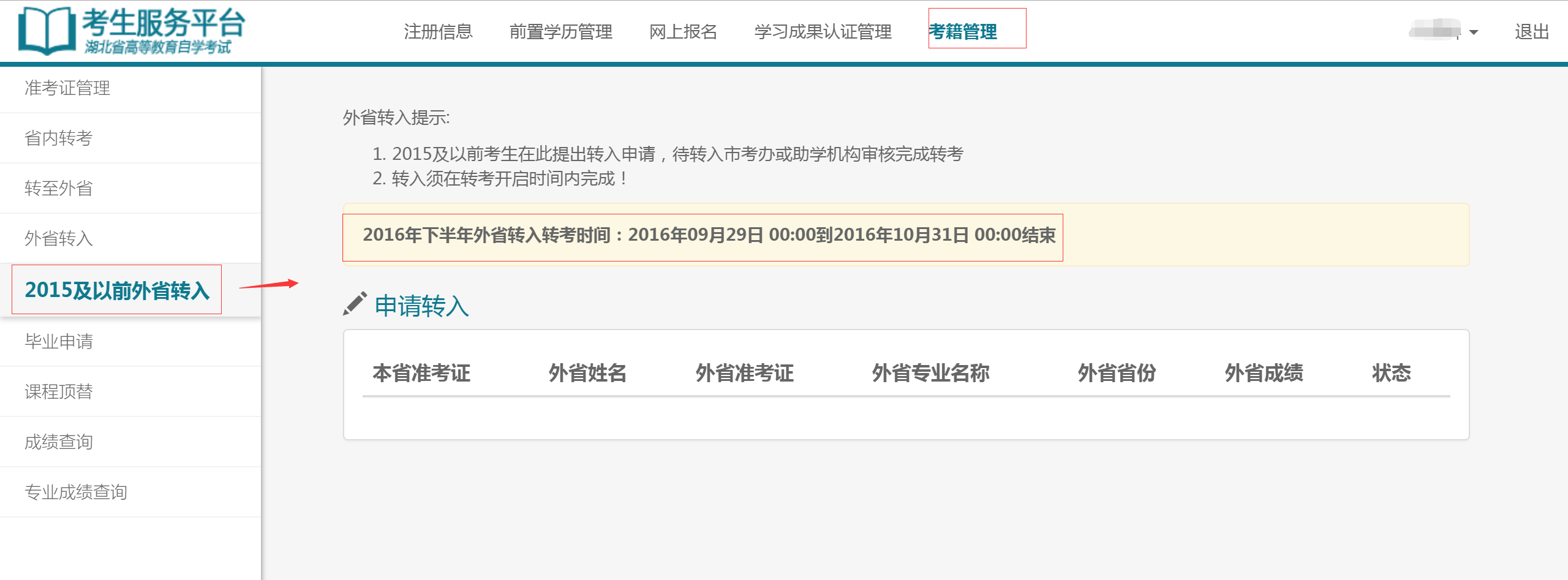 1) 登錄“考生服務平臺”,進入考籍管理---外省轉入頁面: