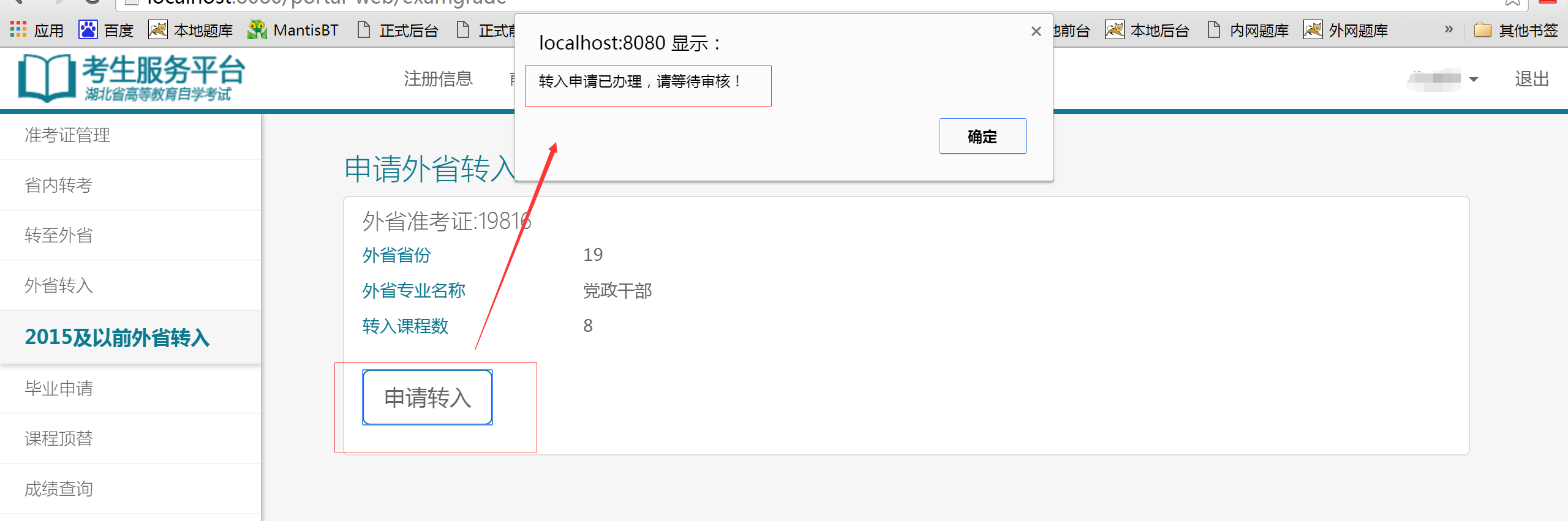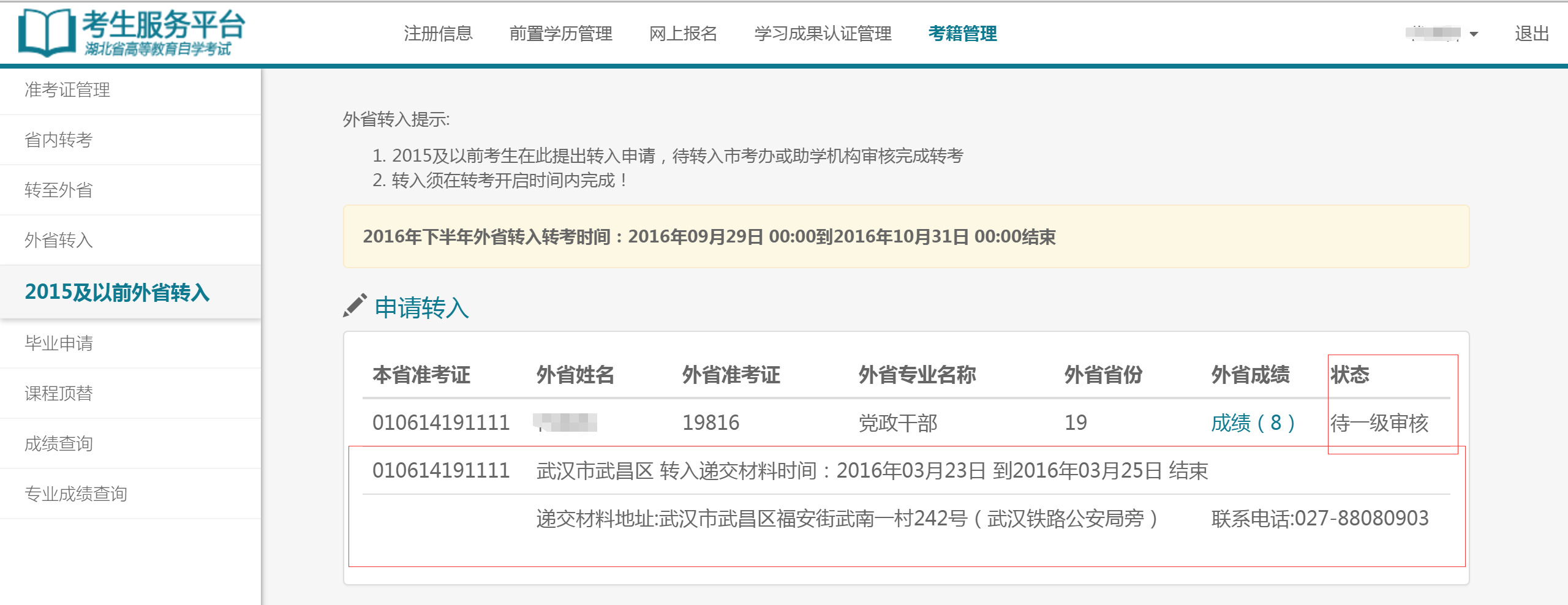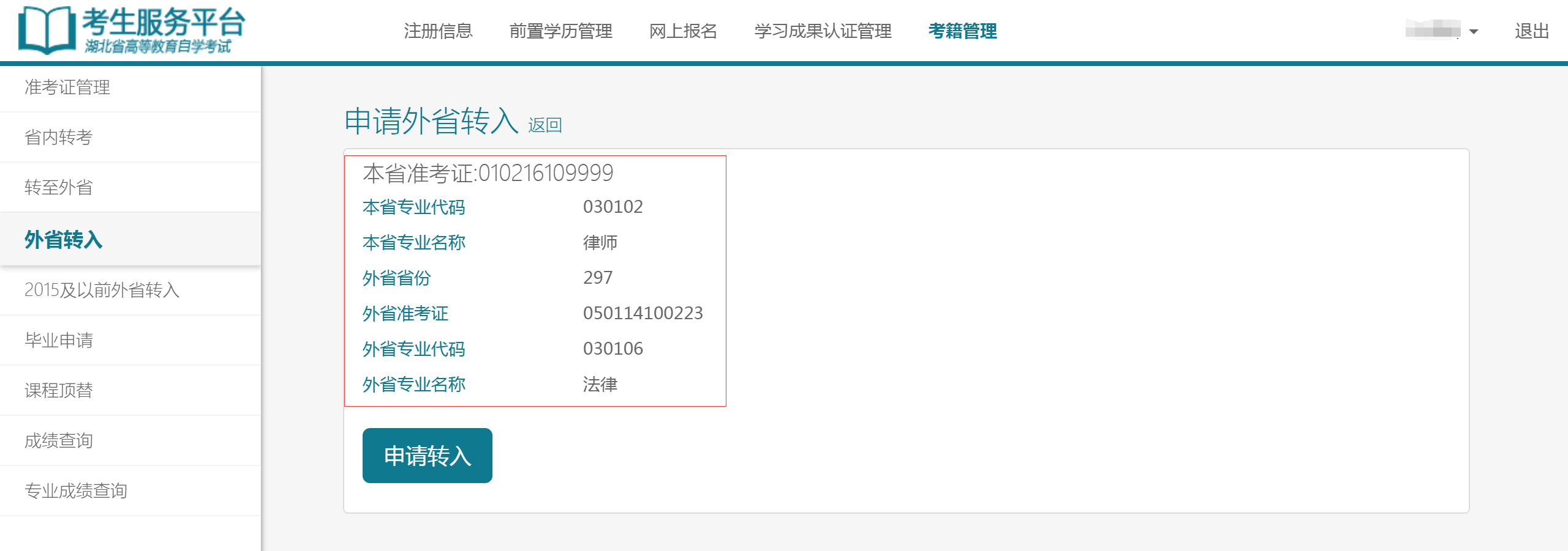 4) 如已在外省辦理過轉出,并且準考證輸入正確,就會顯示外省的轉入至本省的信息,