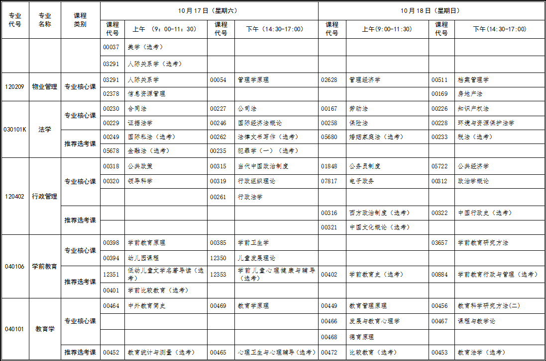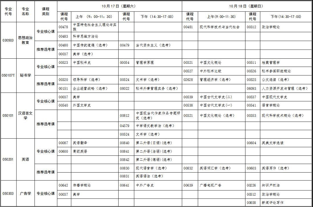 2020年10月湖北自考面向社會(huì)開(kāi)考新課改專(zhuān)業(yè)統(tǒng)考課程考試時(shí)間安排表(本科)